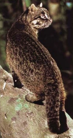 The cat is brown in base fur color marked with rows of dark brown spots which often form into stripes around the neck and legs. The body size rarely reaches 2 feet and the tail and legs are short compared to body size. Little is known of the lifestyle of the cat, although it is thought to be mainly terrestrial and hunts at night. Recent studies of the diet of the cat have revealed that its prey ranges from mammals such as fruit bats, wild pig and rats and varied species of birds to reptiles, fish and insects.