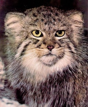 Pallas cats, or Manul, range in the rocky areas and deserts from Iran to China and Mongolia. They are the oldest living species of cat, evolving some 10 million years ago. The Pallas cat's appearance is a bit unusual with a broad head, tiny ears, big eyes, and stocky limbs. The Pallas cat's coat is longer than any of its relatives, and not of uniform color. It can be light-gray, or a combination of yellows and browns.
