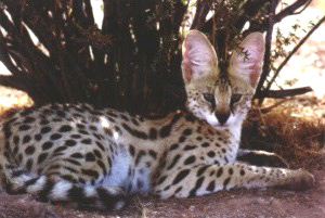 The name Serval is derived from a Portuguese word meaning "wolf-deer." The Serval inhabits the jungles and the plains of Morocco, Algeria and South Africa. This felid has a small head, tall ears, short tail and somewhat resembles a lynx. They have also been mistaken for a small cheetah. Its slender body with the long, springy back legs and shorter front legs helps the serval to leap or jump high for its prey. A serval's weight can range from 25 to 40 pounds. Its body in length (excluding the tail) can range from 24 to 42 inches. The tail length is around 12 - 18 inches. Shoulder height is approximately 20 - 24 inches depending upon the sex of the serval.